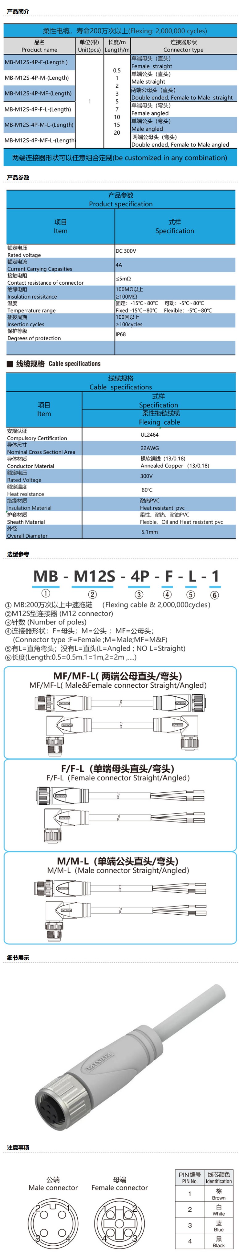 商品名称:拓自达TATSUTA CHUGOKU 中速拖链纯铜PVC绝缘动力线,M12 母头0.5m 直头,20条起订
