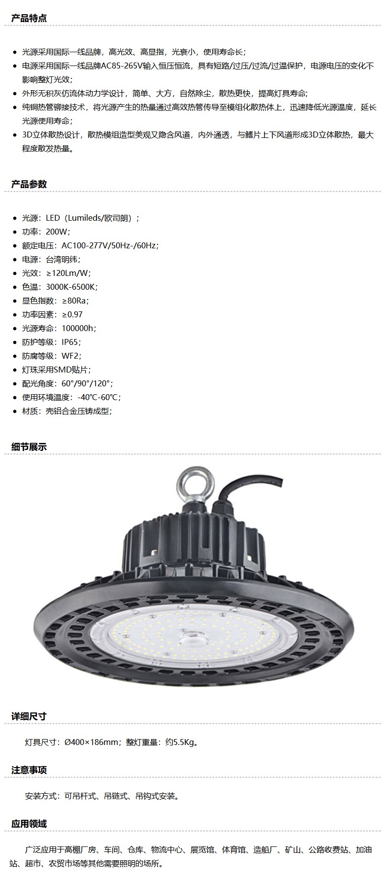 商品名称:永鑫瑞 LED高顶灯,200W白光,YXR-UFO-200W-A-HS,90°配光,含挂环,单位:个