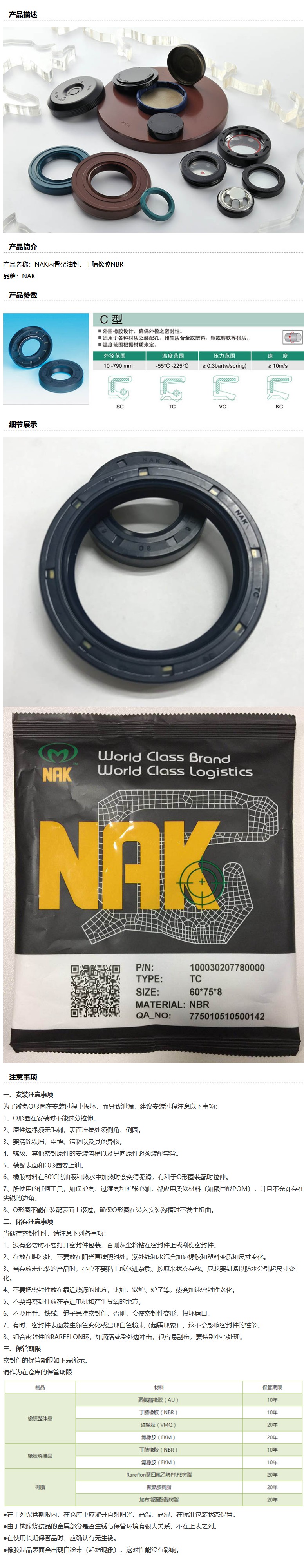 商品名称:NAK/茂顺 丁腈橡胶双唇内骨架油封,TC 62*72*9 NBR,1个/包