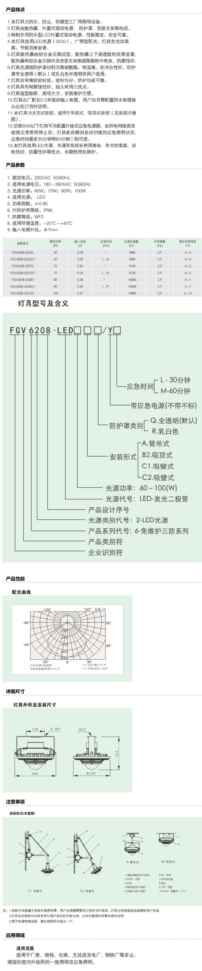 商品名称:森本 LED防水防尘防腐灯,80W 白光,FGV6208-LED80,管吊式 含0.3米管吊 含接线盒,单位:个