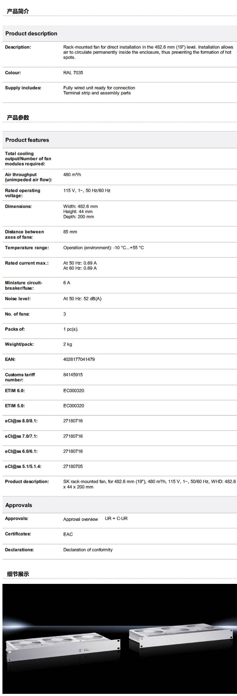 商品名称:威图 机架式风扇,3341.115,用于482.6 mm (19"),480m3/h,115V,含3个风扇