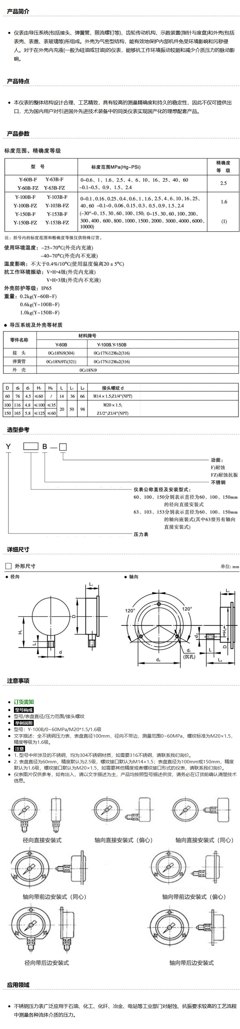 商品名称:上自仪 不锈钢压力表,Y-103BF/0-6.0MPa/M20×1.5/1.6级/304/轴向带边
