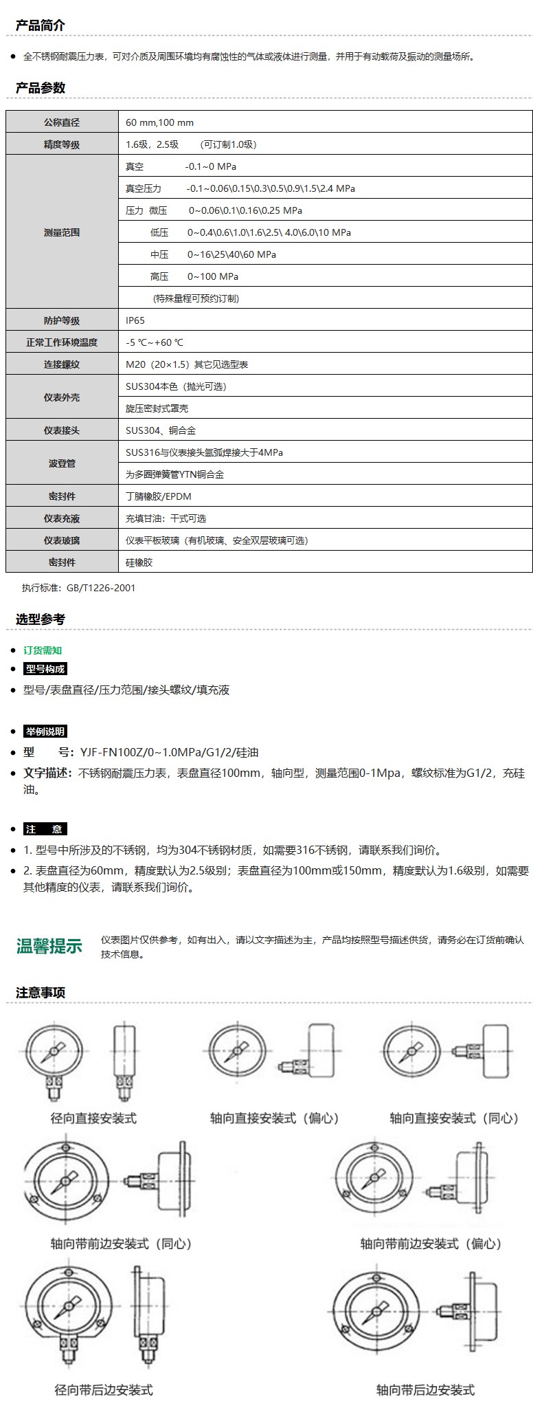 商品名称:万达 耐震压力表,YJF-FN,不锈钢+不锈钢,轴向不带边Φ100,精度1.6级,0~2.5MPa,NPT1/2,充甘油
