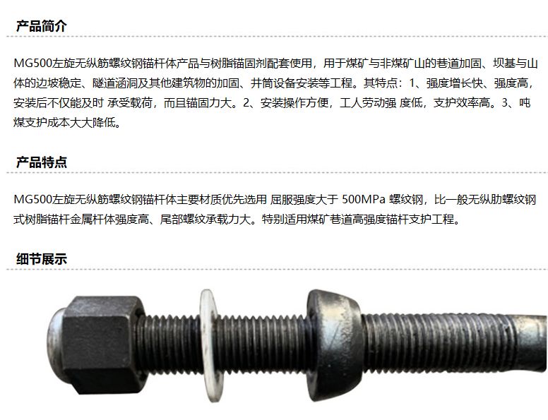 商品名称:神木满泰 MG500左旋无纵筋螺纹钢锚杆,φ18配套螺母减磨垫圈、球形垫