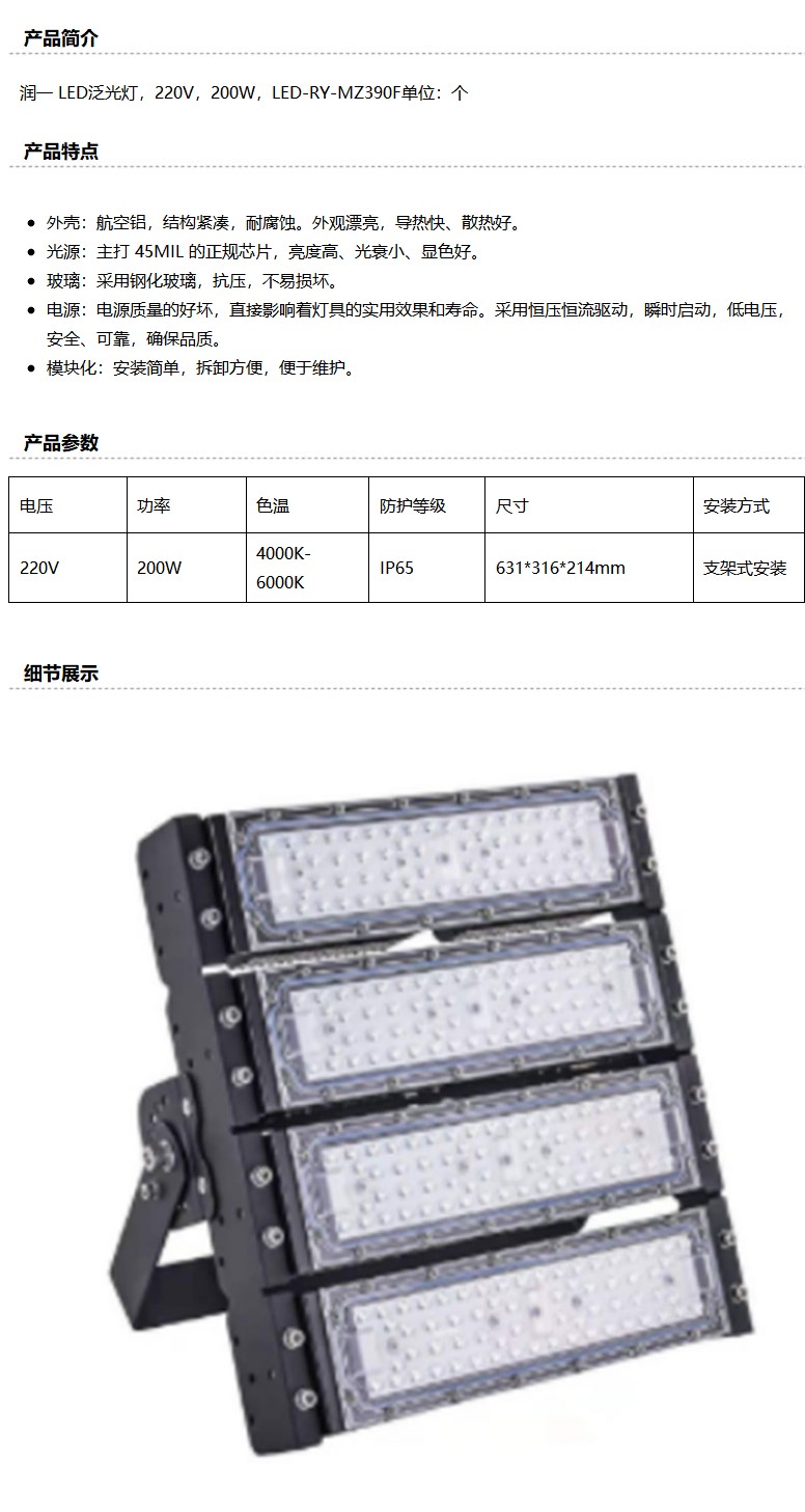 商品名称:润一 LED泛光灯,220V,200W,LED-RY-MZ390F单位:个