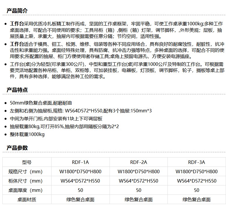 商品名称:锐德 50mm复合桌面工作台,(组合工具柜)1800W*750D*800H,RDF-2A 不含安装费