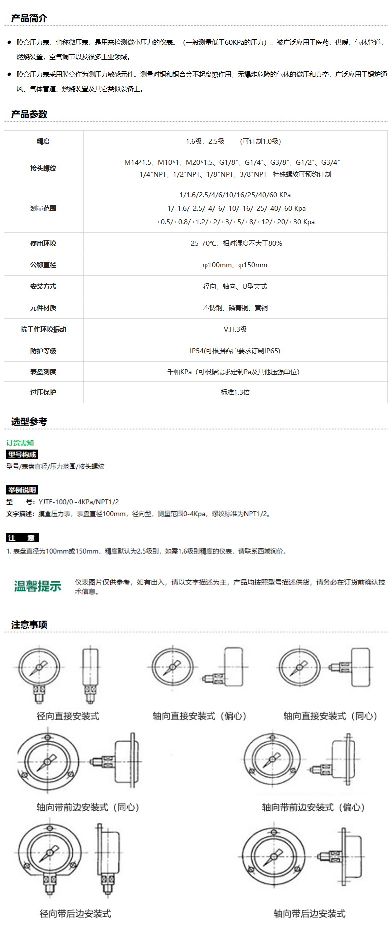 商品名称:万达/WANDA 膜盒压力表YJTE,碳钢+铜,径向不带边Φ100,精度2.5级,-12~12KPa,M20*1.5