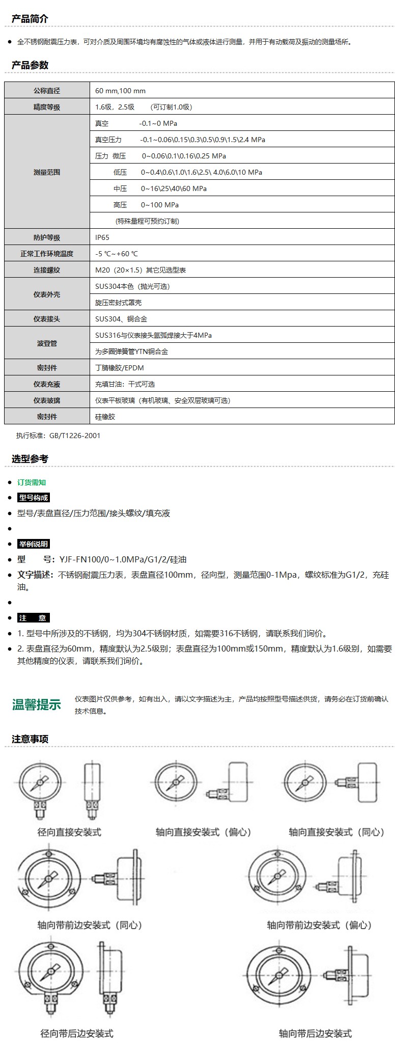 商品名称:万达 耐震压力表,YJF-FN,不锈钢+不锈钢,径向不带边Φ100,精度1.6级,0~1.0MPa,G1/2,充甘油