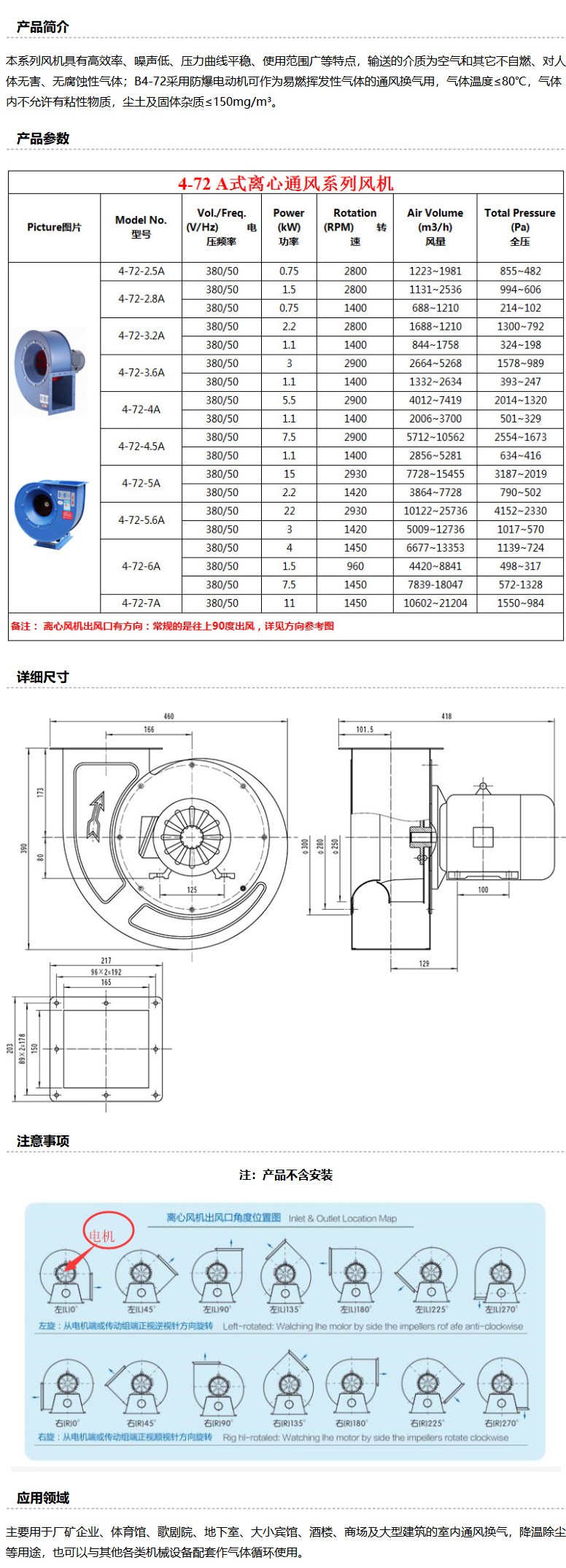 商品名称:九洲普惠 4-72系列离心通风机,4-72-2.5A,0.75KW,380V,左旋180°,含脚,含木架包装