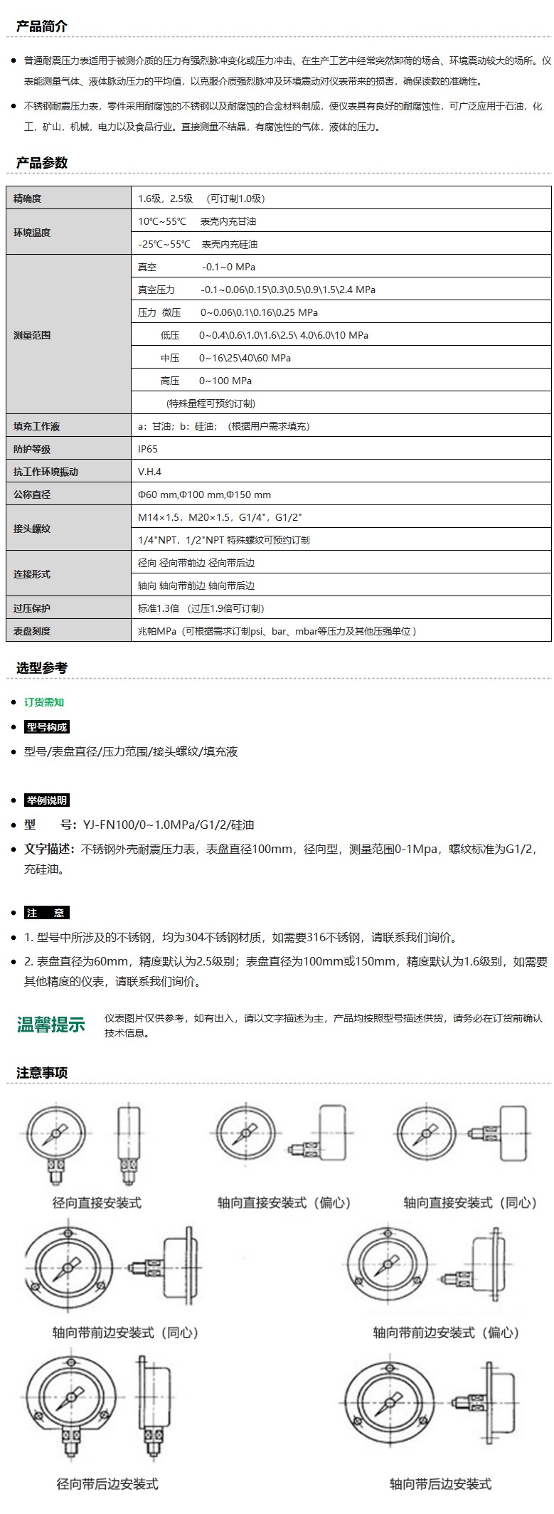 商品名称:万达 耐震压力表,YJ-FN,不锈钢+铜,径向不带边Φ100,精度1.6级,0~0.25MPa,M20*1.5,充硅油
