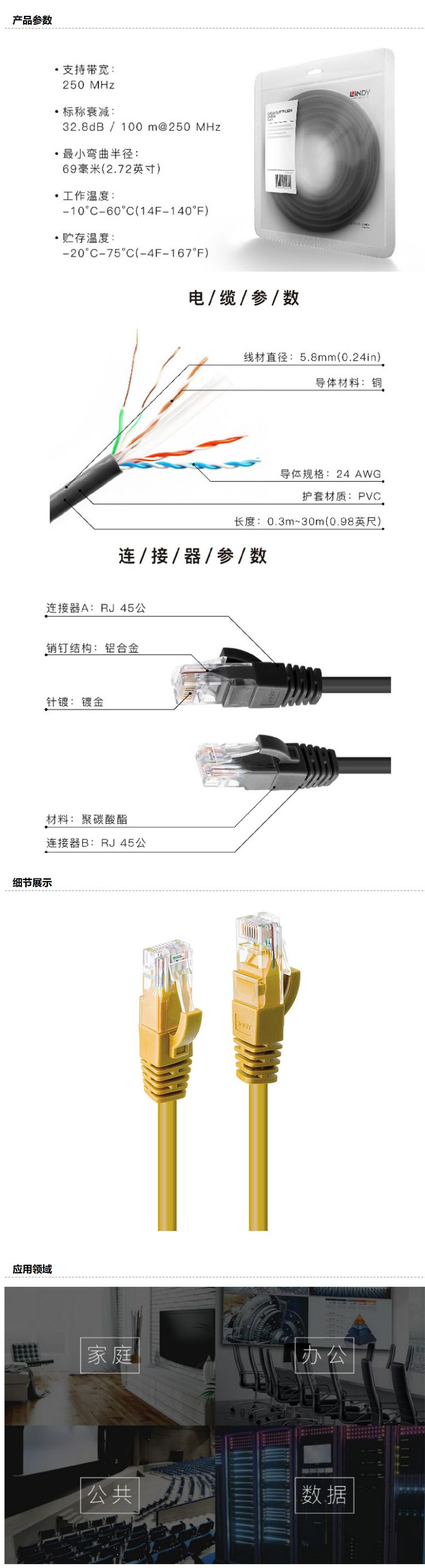 商品名称:林迪LINDY 工业级Cat.6 U/UTP高速6类纯铜千兆线非屏蔽跳线,黄色 10米,48067