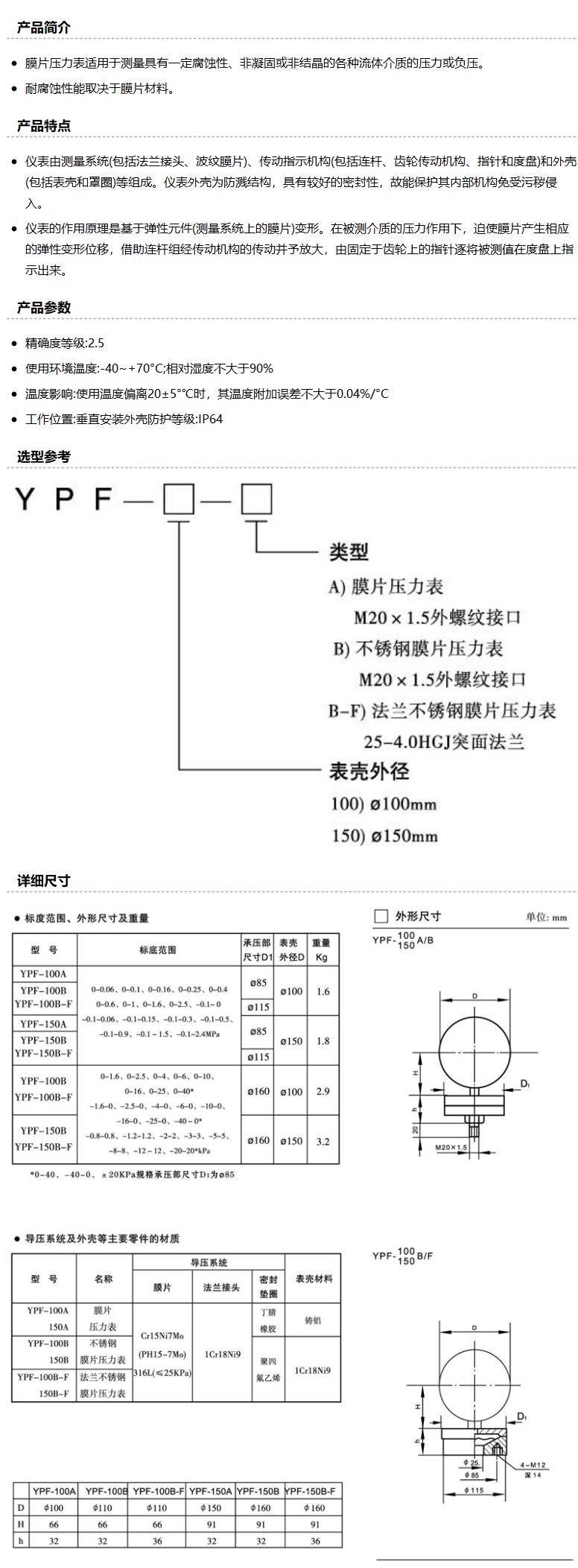 商品名称:上自仪 膜片压力表,YPF-150A/0-1MPa/G1/2/2.5级/表壳铝+膜片316L/径向不带边