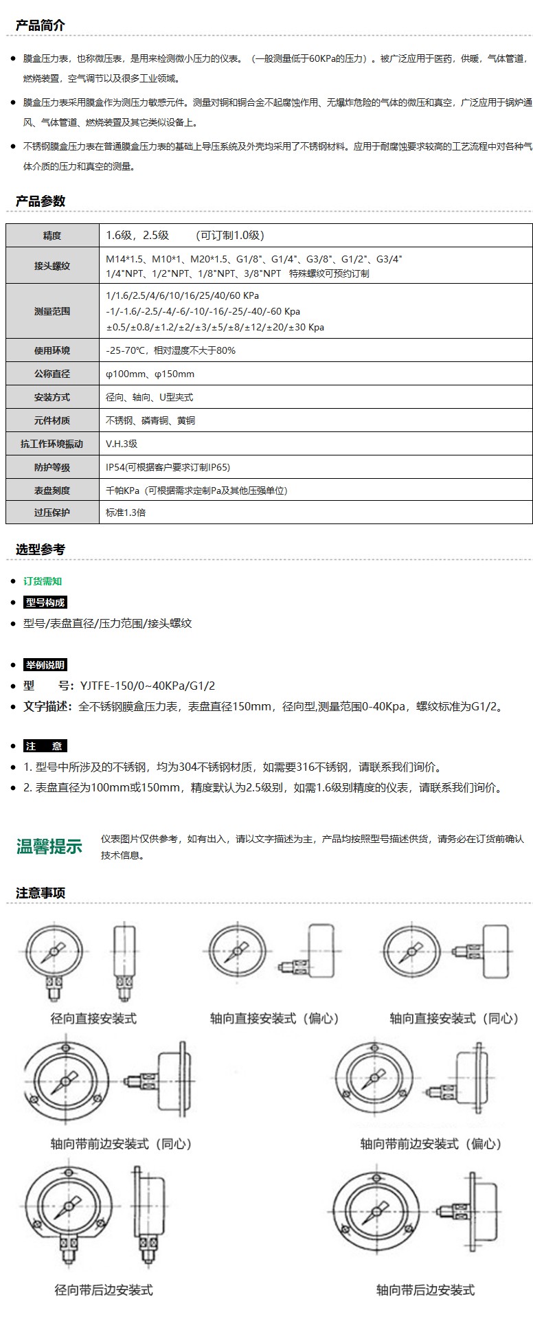 商品名称:万达/WANDA 膜盒压力表YJTFE,全不锈钢,径向不带边Φ150,精度2.5级,-4~4KPa,M20*1.5