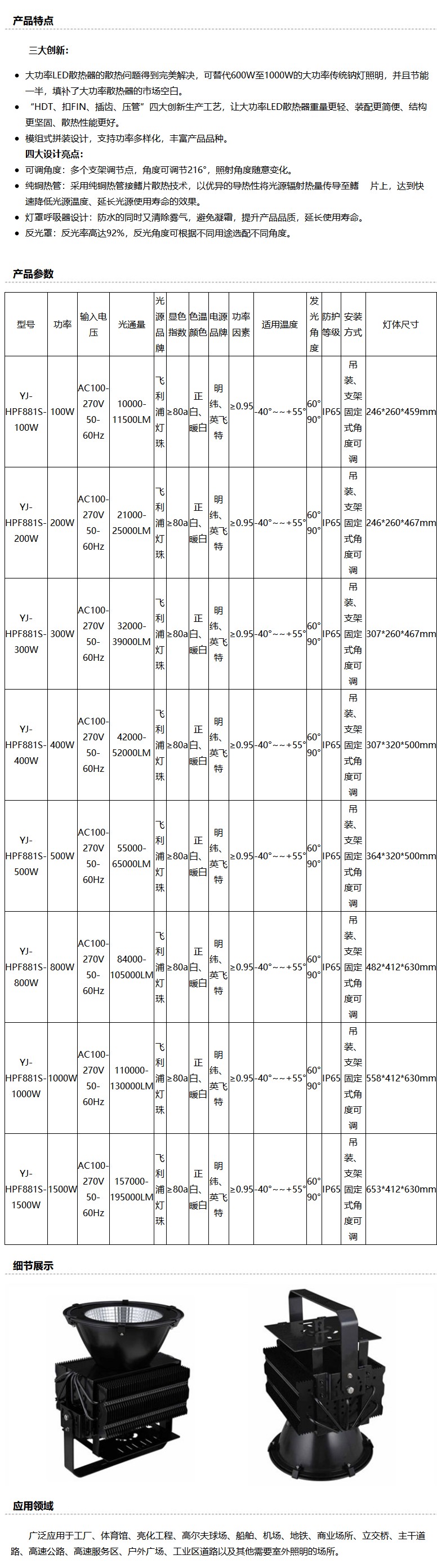 商品名称:雅金照明YJ-HPF881S-1500WLED工矿灯 白光 单位:个