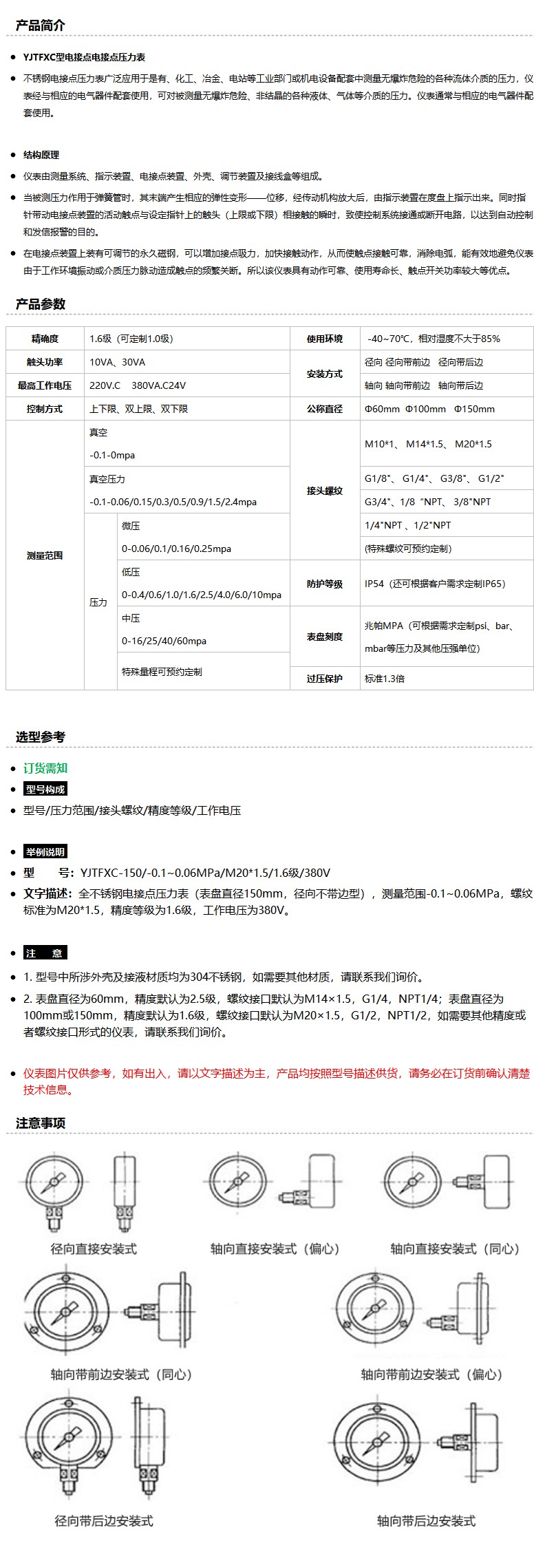 商品名称:全不锈钢电接点压力表,YJTFXC-150,304不锈钢,径向不带边,Φ150,0~40MPa,G1/2,1.6级,24V