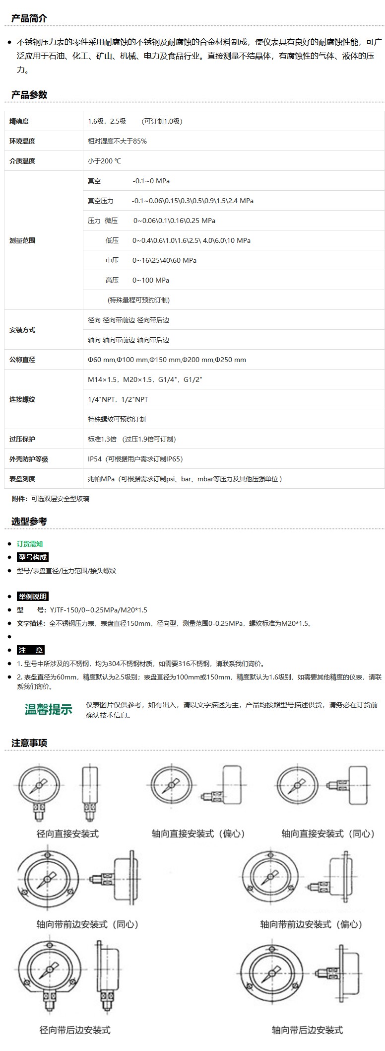商品名称:万达/WANDA 压力表YJTF,全不锈钢,径向不带边Φ100,精度1.6级,0~60MPa,NPT1/2
