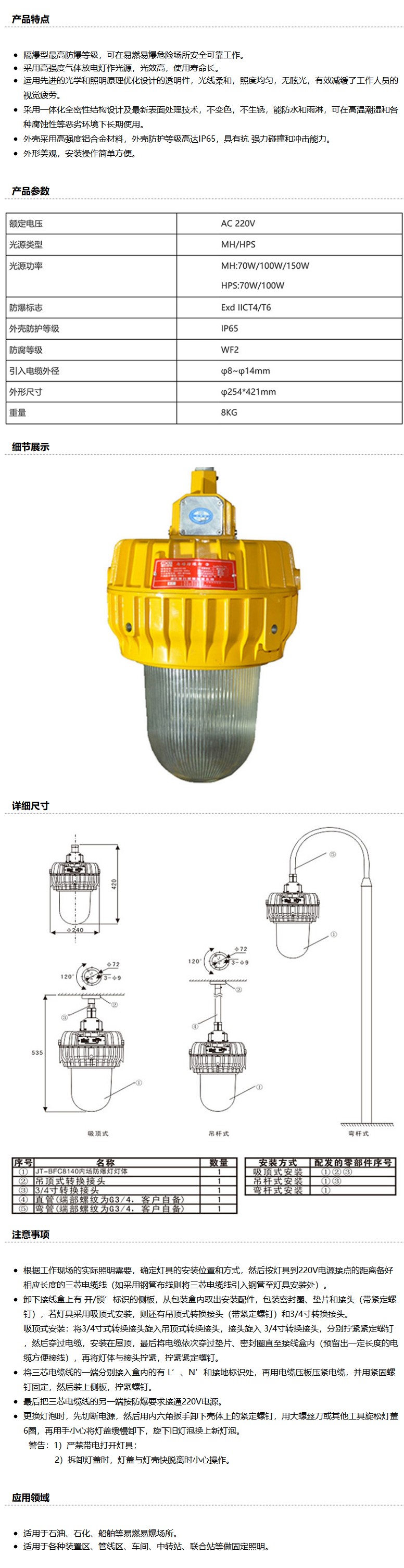 商品名称:景天照明 内场防爆灯,JT-BFC8140,150W,弯杆式安装,不含灯杆,单位:个