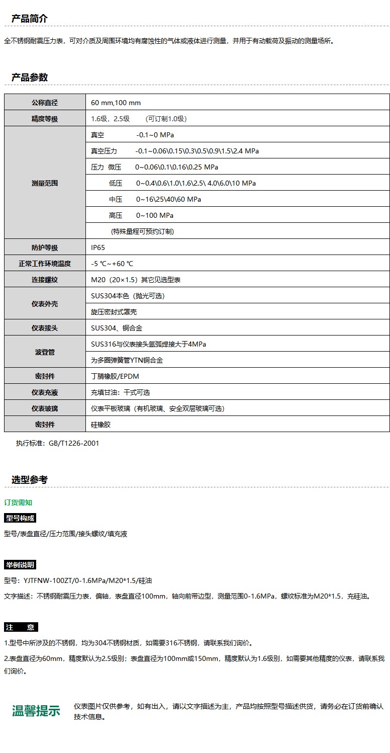 商品名称:耐震压力表,YJTFNW,偏轴,全不锈钢,径向不带边Φ100,精度1.6级,0~2.5MPa,NPT1/2,充硅油