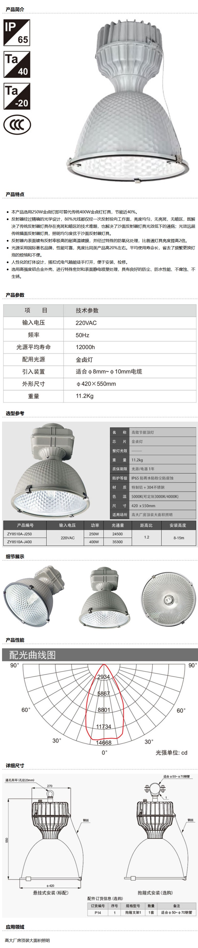 商品名称:通明电器 节能高顶灯,ZY8510A-J250 功率250W白光吊环式,单位:个