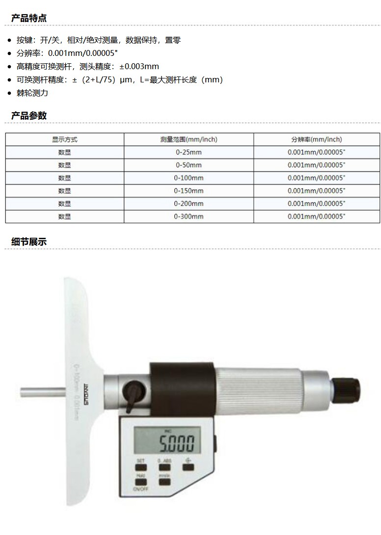 商品名称:INVOUS 数显球头深度千分尺,0-300mm,IS787-87573