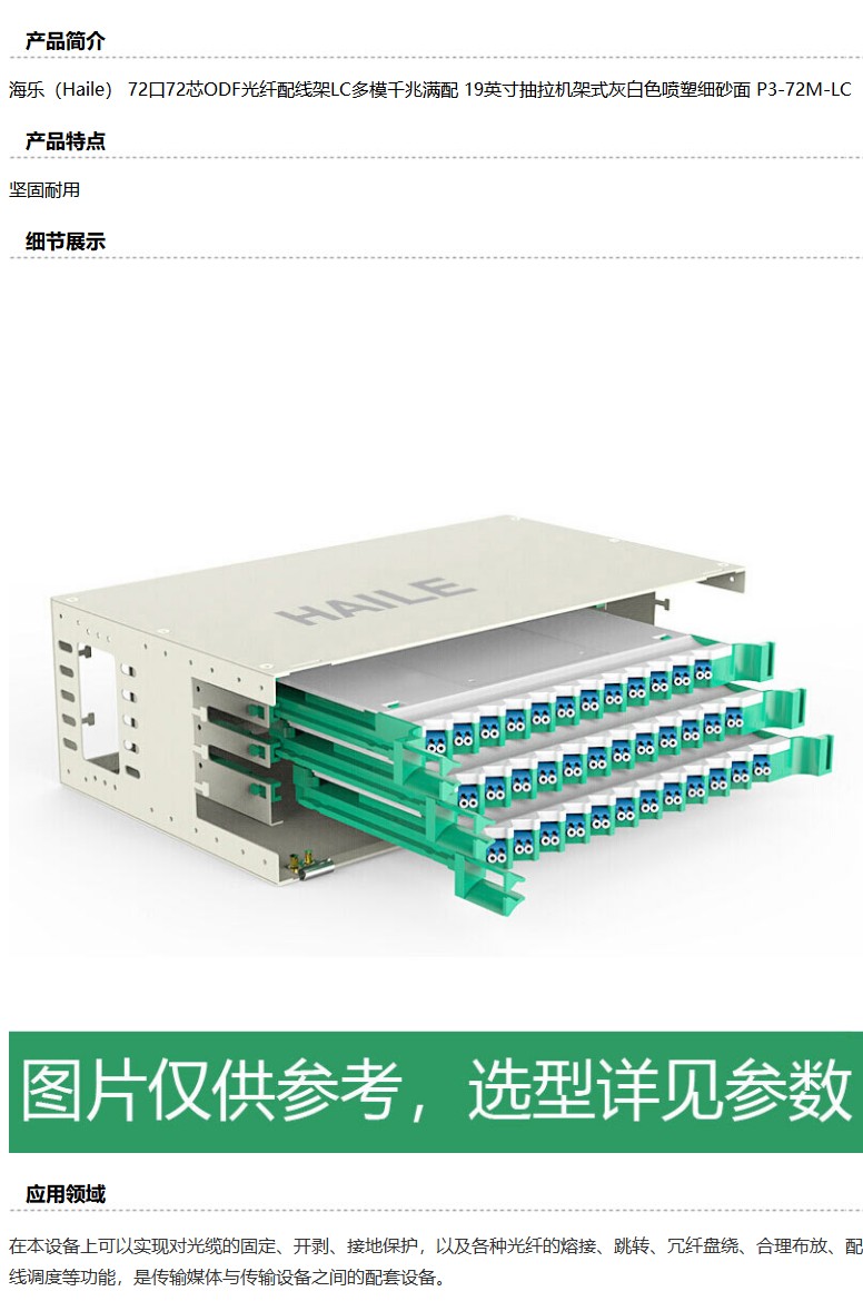 商品名称:海乐Haile 36口72芯ODF光纤配线架 LC多模千兆满配,19英寸抽拉机架式灰白色喷塑细砂面,P3-72M-LC