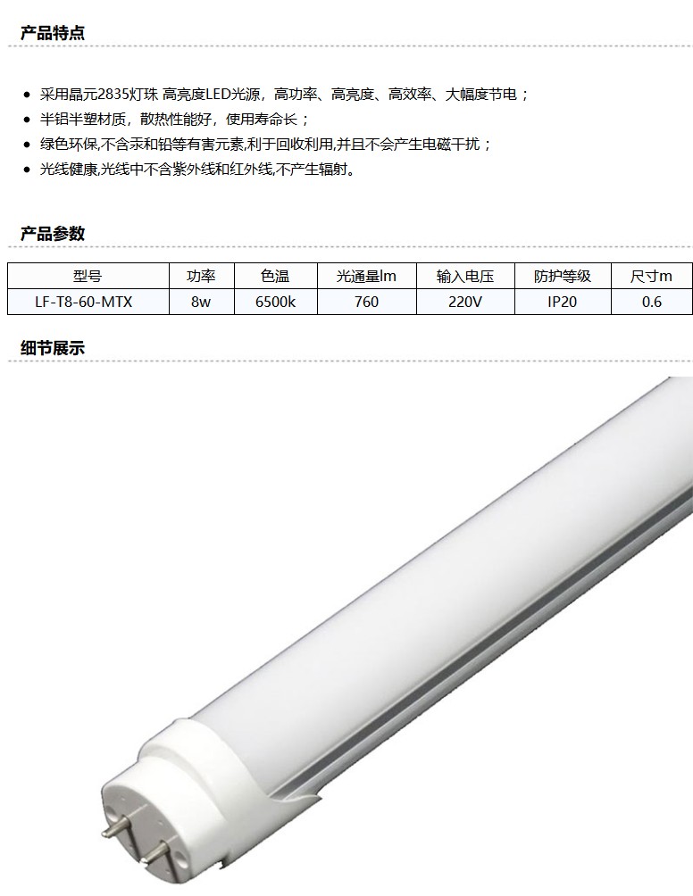 商品名称:雷发照明 LED T8铝塑灯管,8W,白光,0.6M,LF-T8-60-MTX,双端进电,50个/箱,单位:箱