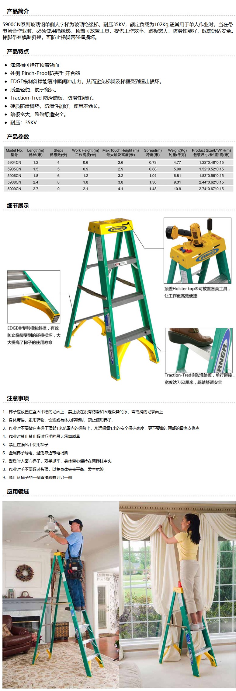 商品名称:稳耐 绝缘单侧人字梯 踏台数:6 额定载荷(KG):102 工作高度(米):1.2 耐压(KV):35,5906CN
