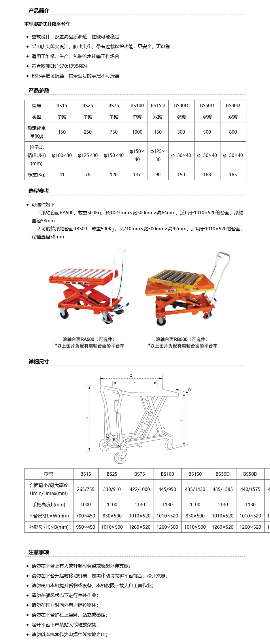 商品名称:虎力 重型脚踏式升降平台车,150kg 平台:700*450mm 最大高度:755mm,BS15
