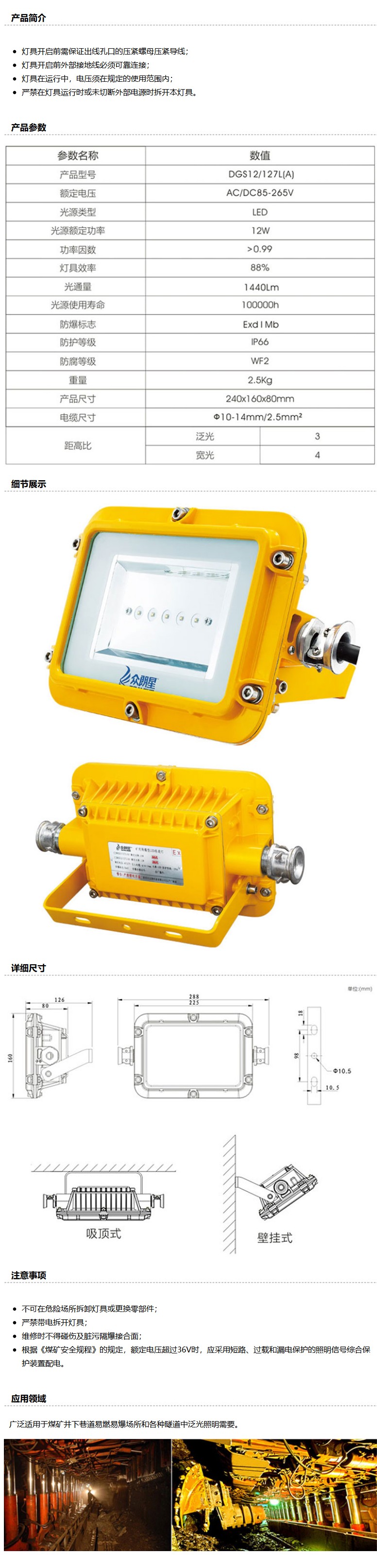 商品名称:众朗星 矿用隔爆型LED巷道灯,DGS12/127L,12W LED 白光,煤安证号MAH120189,单位:个