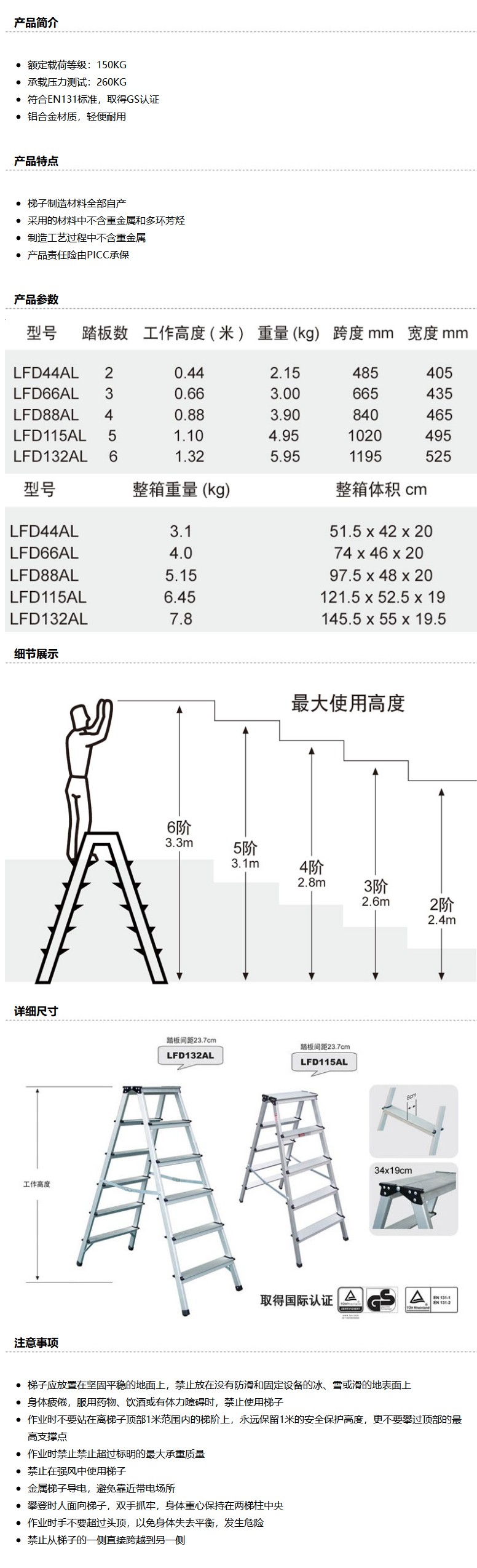 商品名称:金锚 铝合金梯凳,踏板数:2 额定载荷(KG):150 工作高度(米):0.44,LFD44AL
