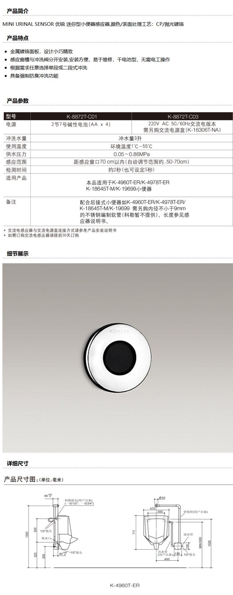 商品名称:科勒 优锐迷你型小便感应冲洗器(抛光镀铬),K-8872T-C03-CP,需另购电源盒