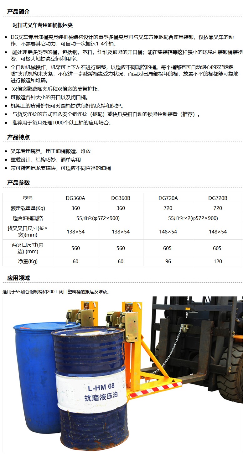 商品名称:虎力 双叼扣叉车专用油桶搬运夹,承重720kg适合油桶规格55加仑,DG720B