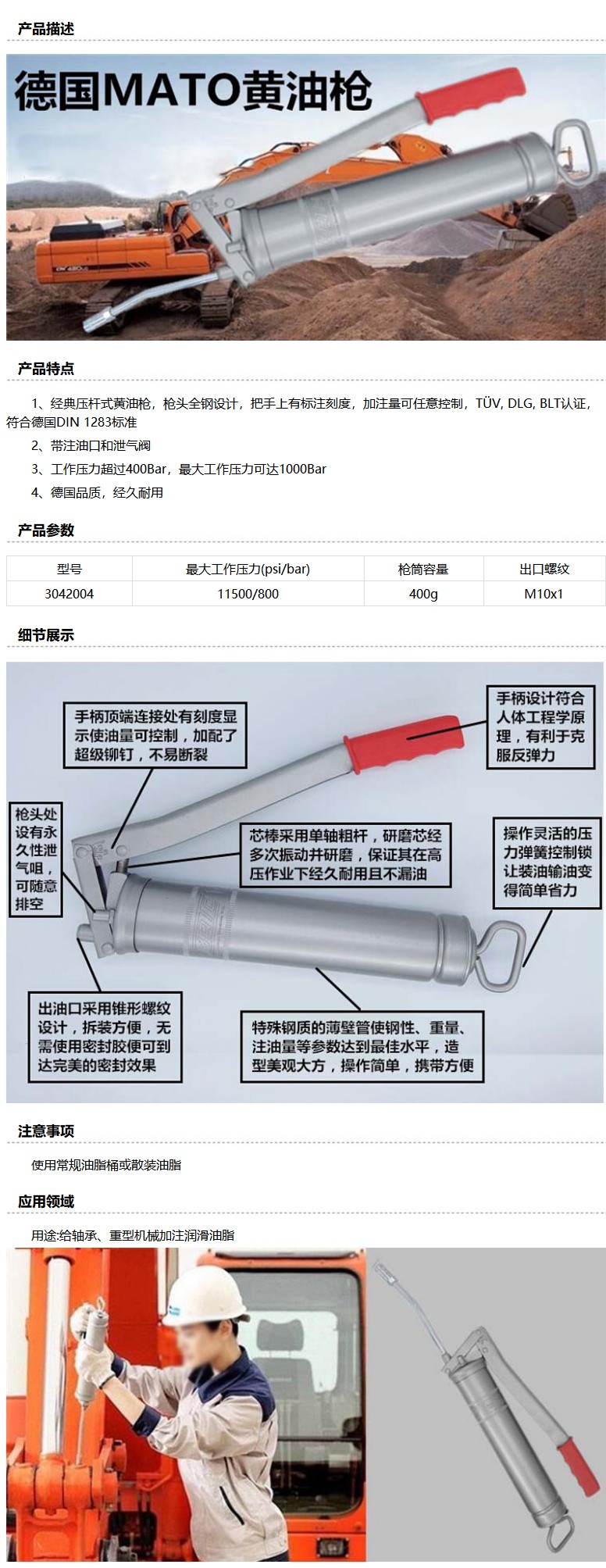 商品名称:MATO 3042004 全钢压杆式黄油枪,含注油嘴和放气阀,不带附件,螺纹M10x1,容量400g油脂桶