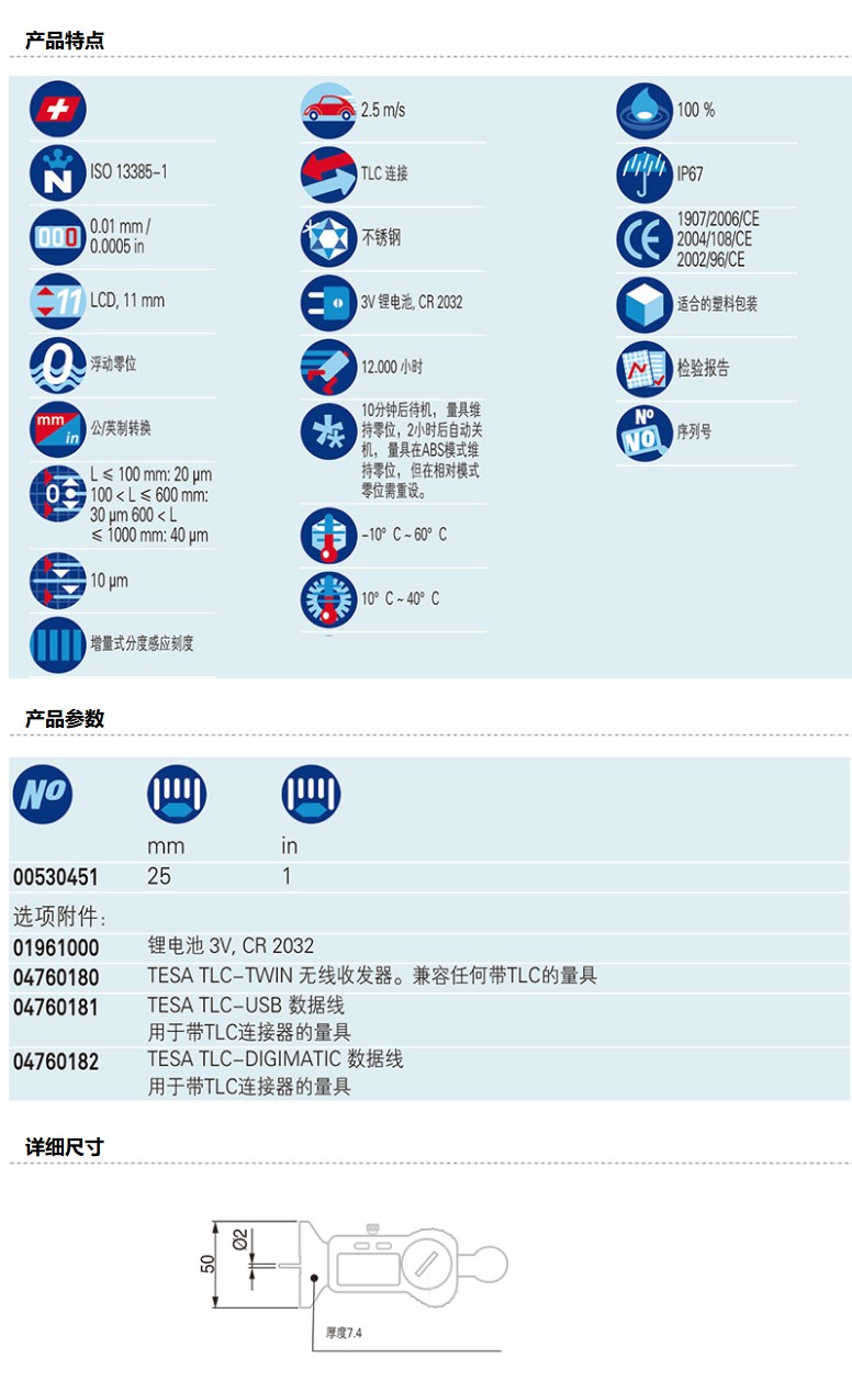 商品名称:Tesa 数显深度千分尺,0-25、小规格带细测量面(IP67),00530451,不含第三方检测