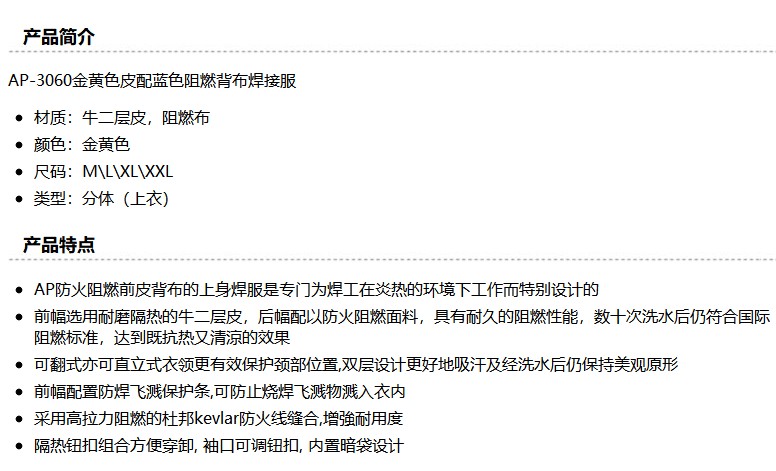 商品名称:友盟 焊接防护服,AP-3060-M,金黄色皮配蓝色阻燃背布焊接服