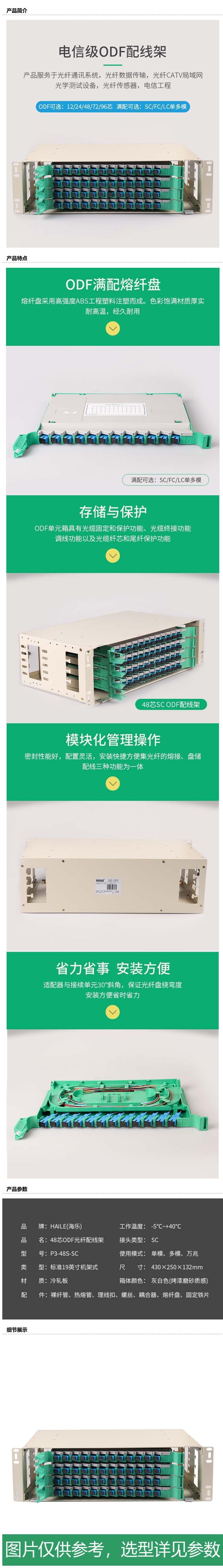 商品名称:海乐(Haile) 48口ODF光纤配线架SC单模满配 19英寸抽拉机架式灰白色喷塑细砂面 P3-48S-SC