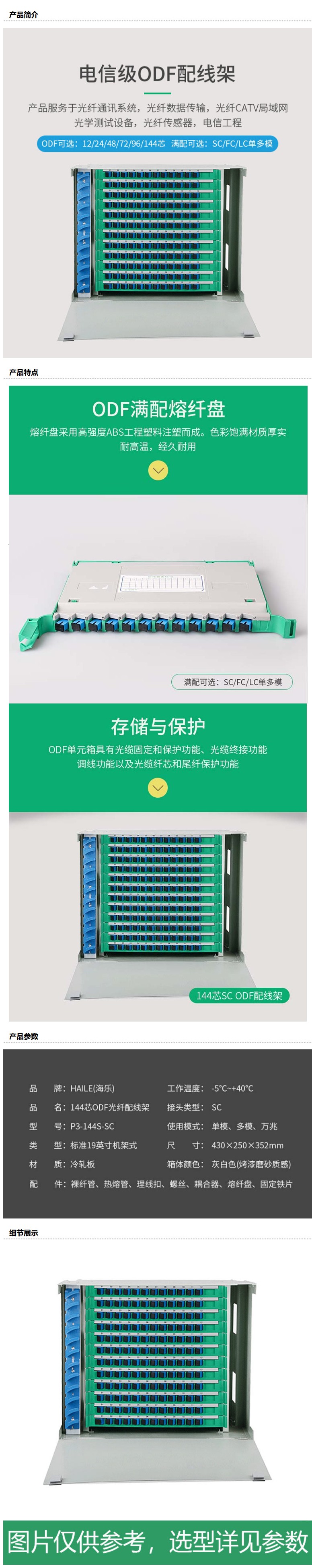 商品名称:海乐(Haile)144芯ODF光纤配线架SC单模满配 19英寸抽拉机架式灰白色喷塑细砂面P3-144S-SC