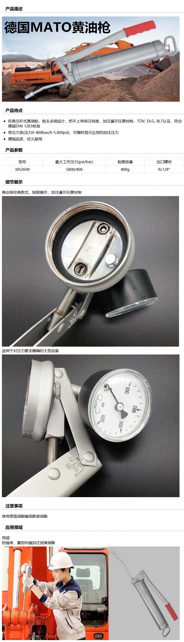 商品名称:MATO 3052690 压力计量黄油枪,螺纹R1/8",不带附件