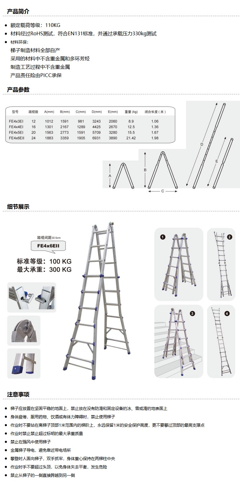 商品名称:金锚 美式铝合金折叠延伸梯 踏棍数:12 额定载荷(KG):110 人字高度(米):1.6,FE4×3EI