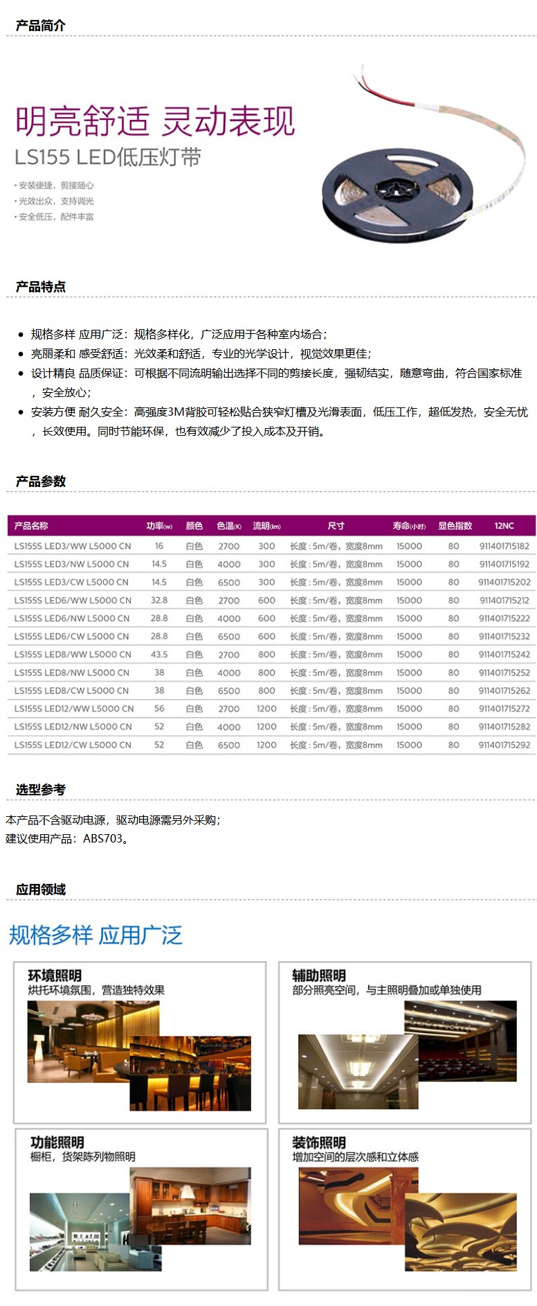 商品名称:飞利浦 明欣LED灯带 DC24V LS155S LED12/WW L5000 CN 功率56w 黄光 长度:5m/卷,宽度8mm,单位:卷