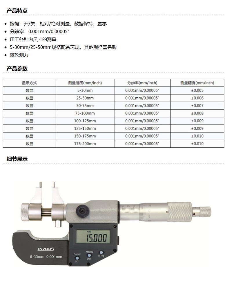 商品名称:INVOUS 数显内径千分尺,125-150mm,IS787-87601