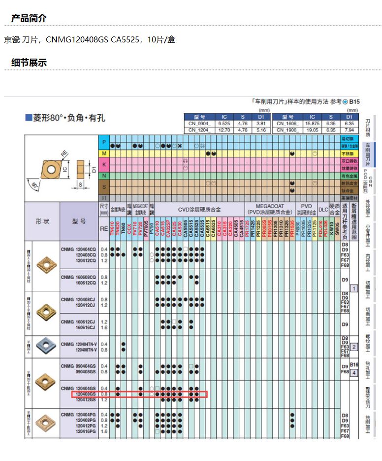 商品名称:京瓷 刀片,CNMG120408GS CA5525,10片/盒