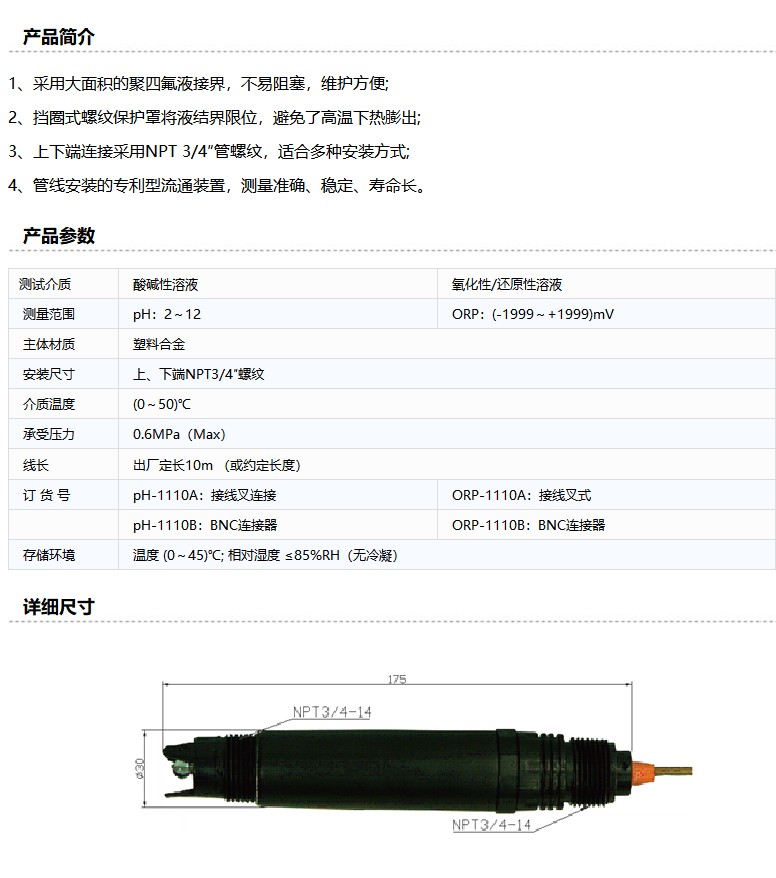 商品名称:科瑞达 氧化还原在线分析仪传感器,ORP-1110A 10m线 上下端NPT3/4"螺纹 10m线