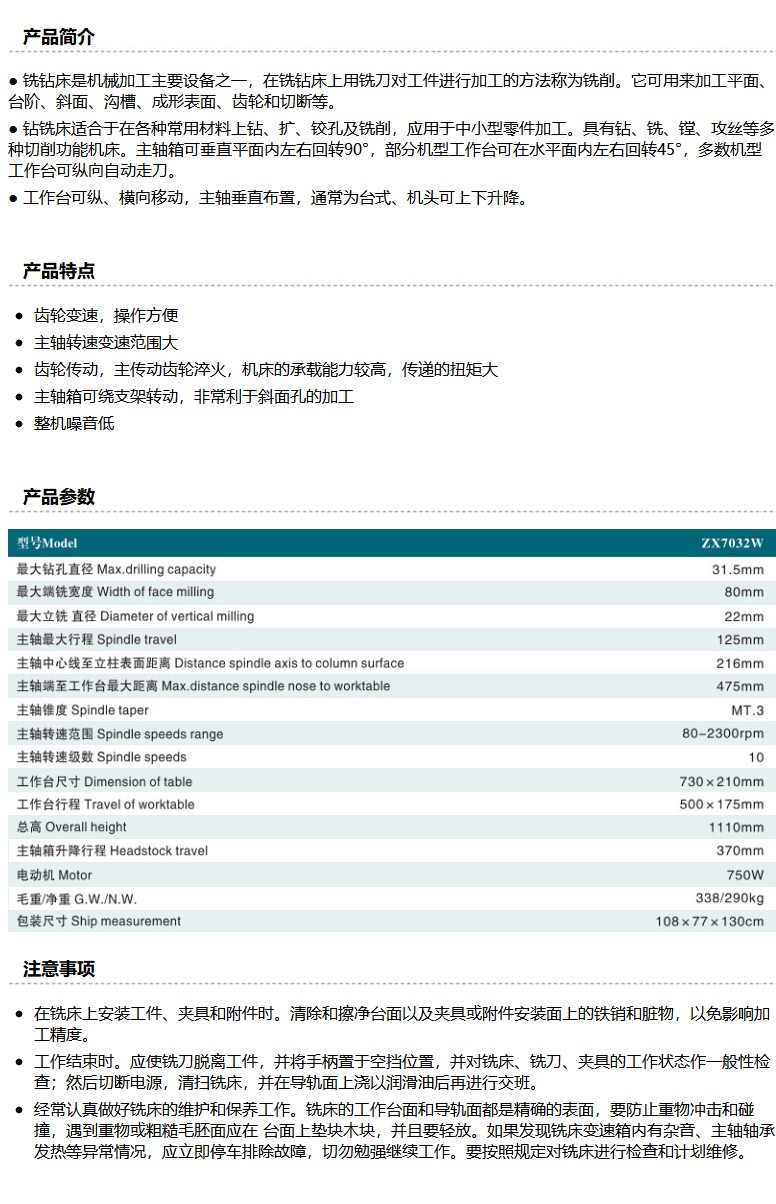 商品名称:西湖 铣钻床ZX7032W/380V,最大钻孔直径32mm