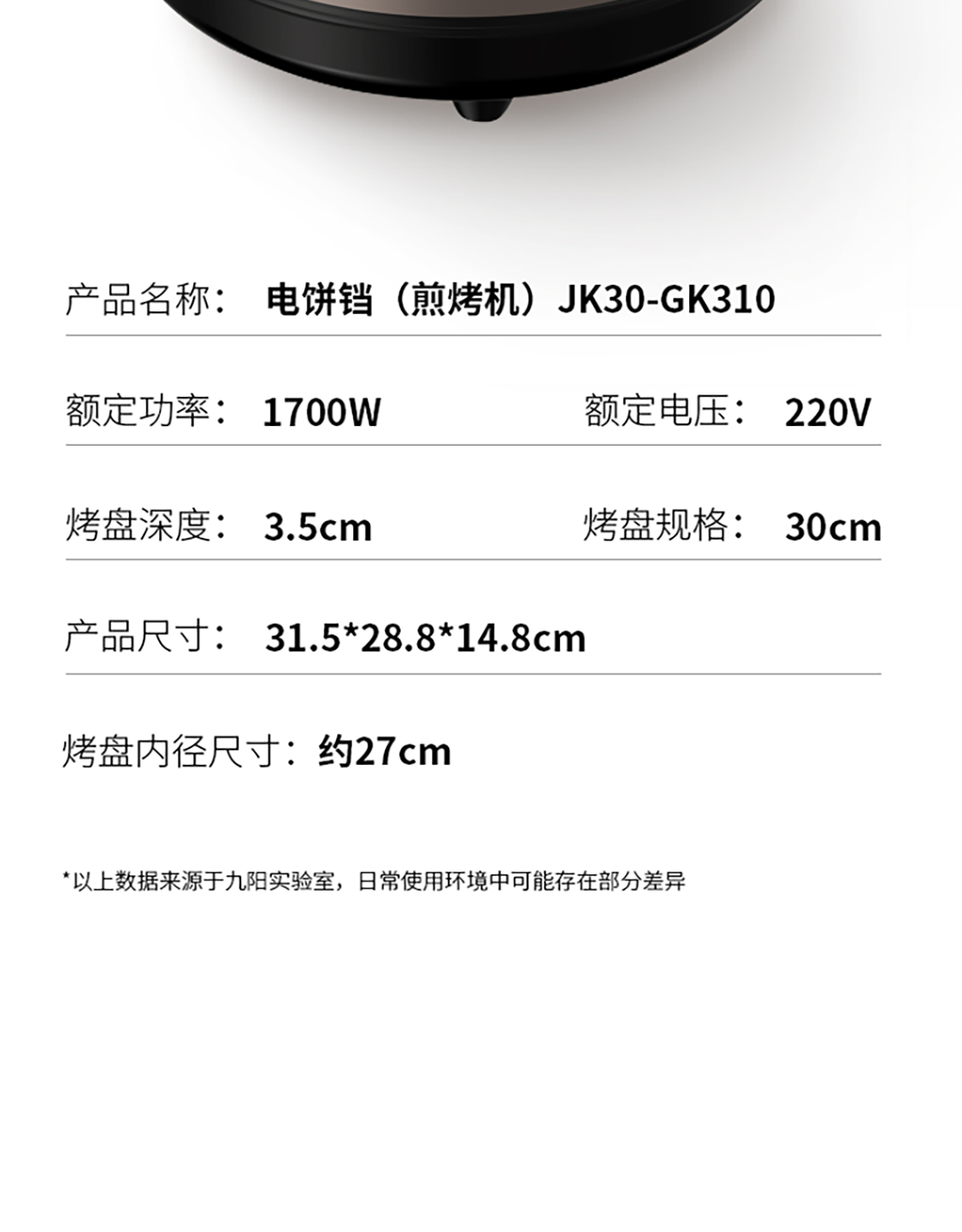 商品名称:九阳(Joyoung)JK30-GK310 30cm电饼铛 多功能煎饼机 (单位:台)