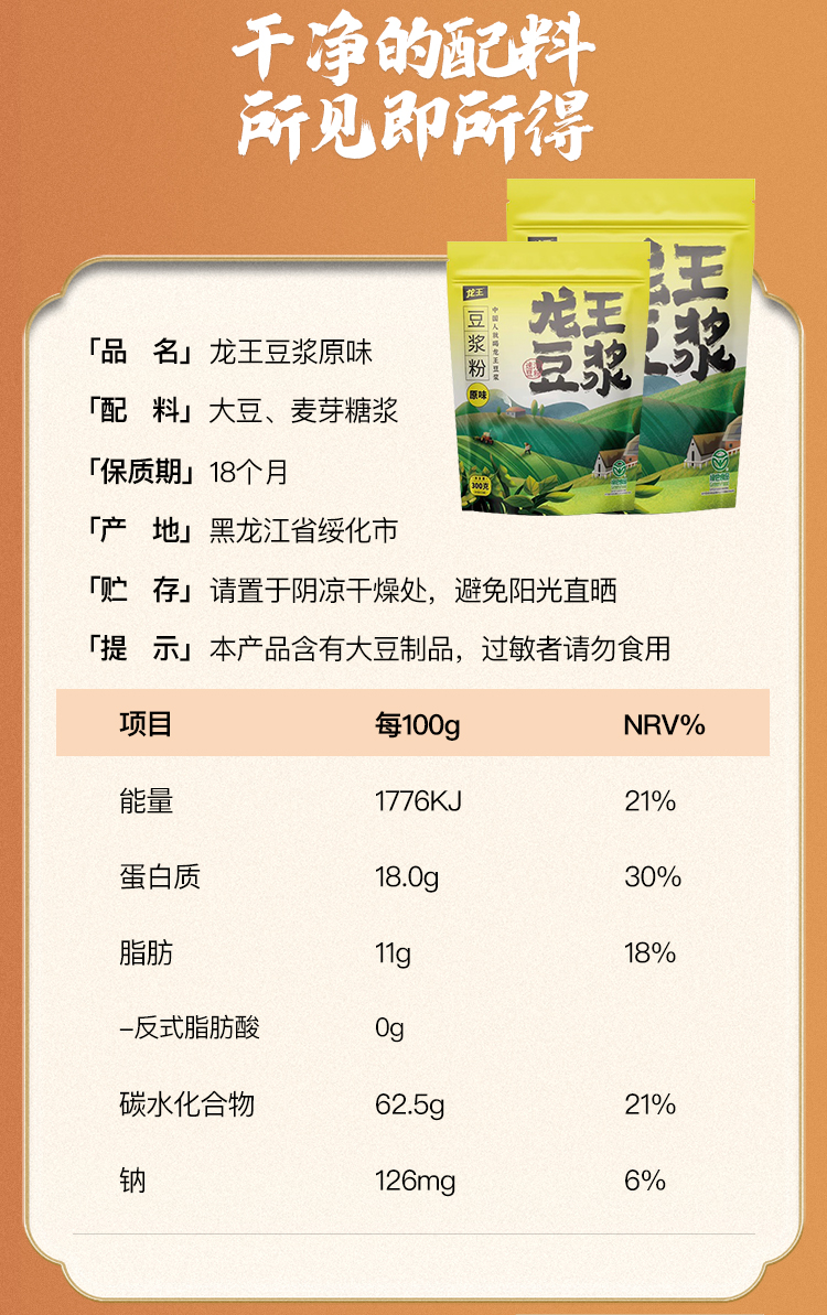 商品名称:龙王速溶豆浆粉原味600g 早餐速溶豆粉学生健身蛋白质 600g*1袋 原味