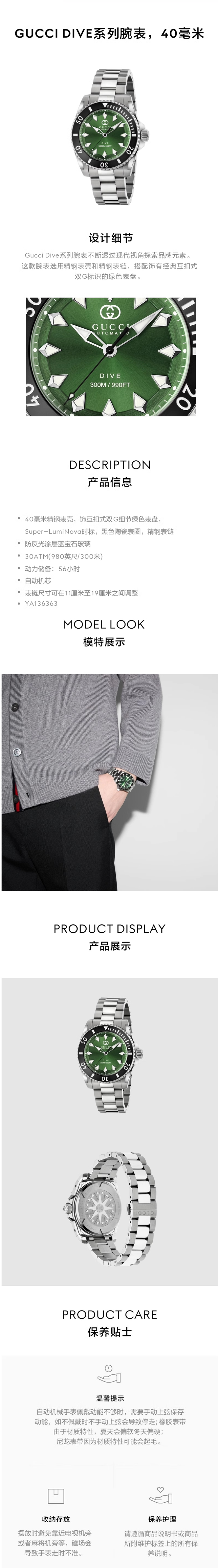 商品名称:古驰GUCCI Dive系列机械男表手表40毫米 YA136363(单位:1块) 绿色