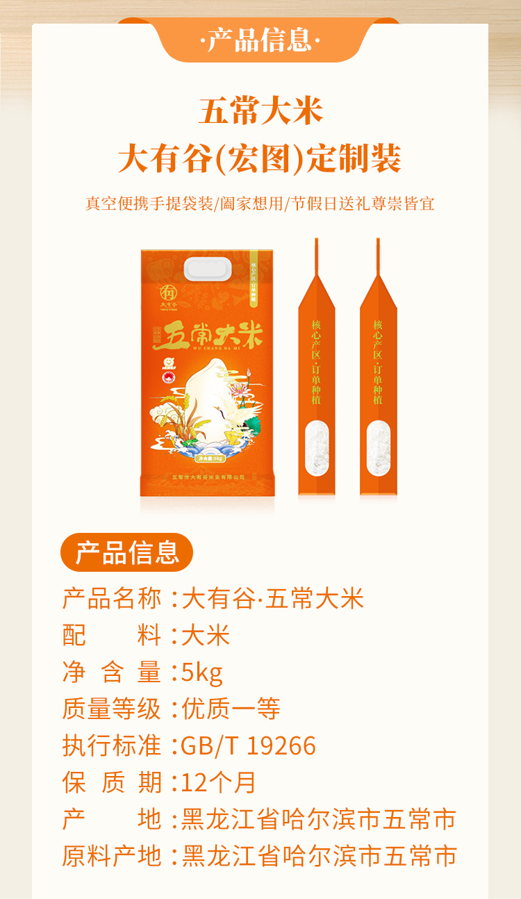 商品名称:大有谷 黑龙江核心产区五常大米 宏图袋装5kg 橙色
