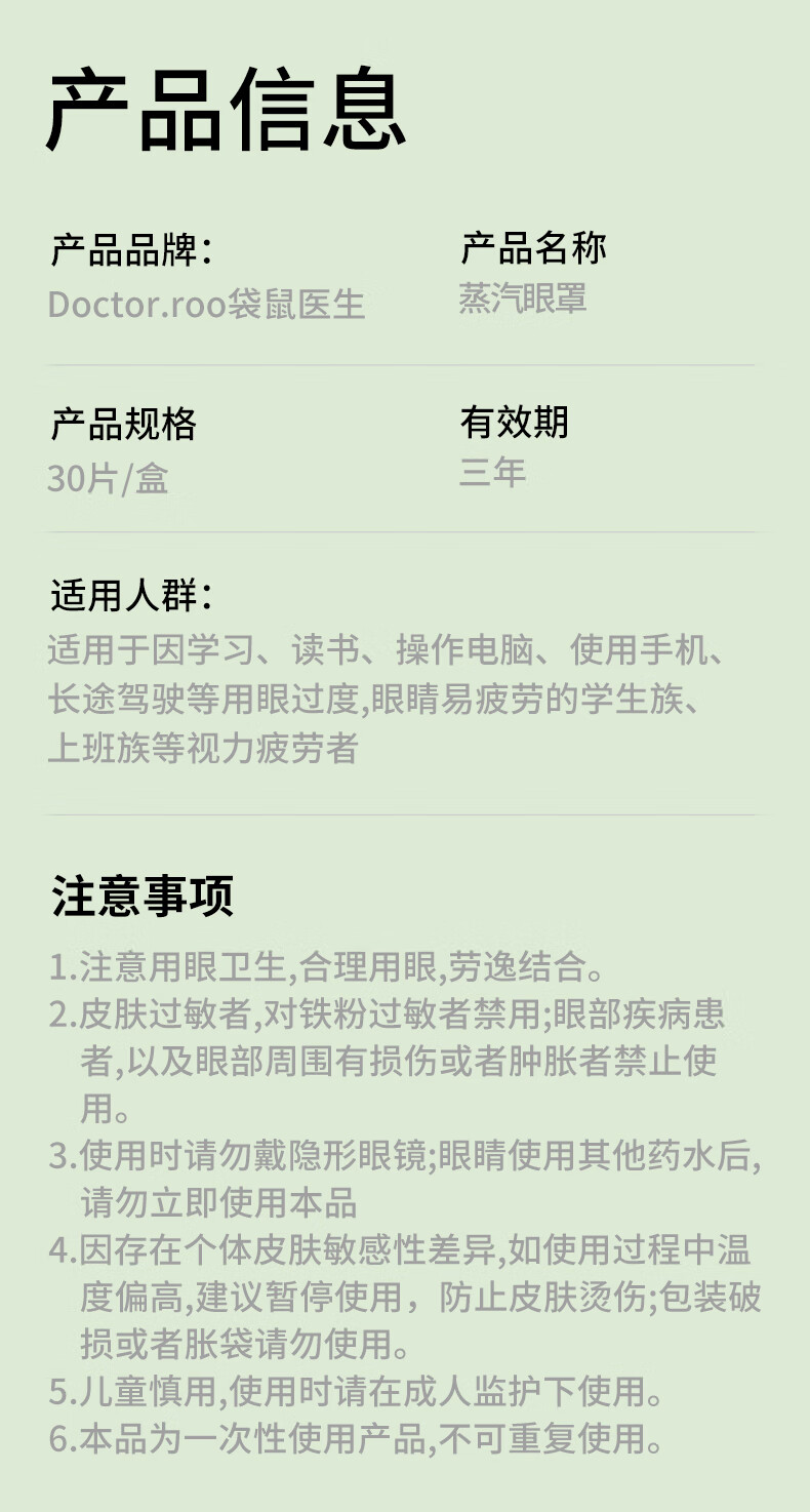 商品名称:袋鼠医生 蒸汽眼罩热敷无香型30片/盒 自发热眼罩眼贴遮光男女通用 单位:盒