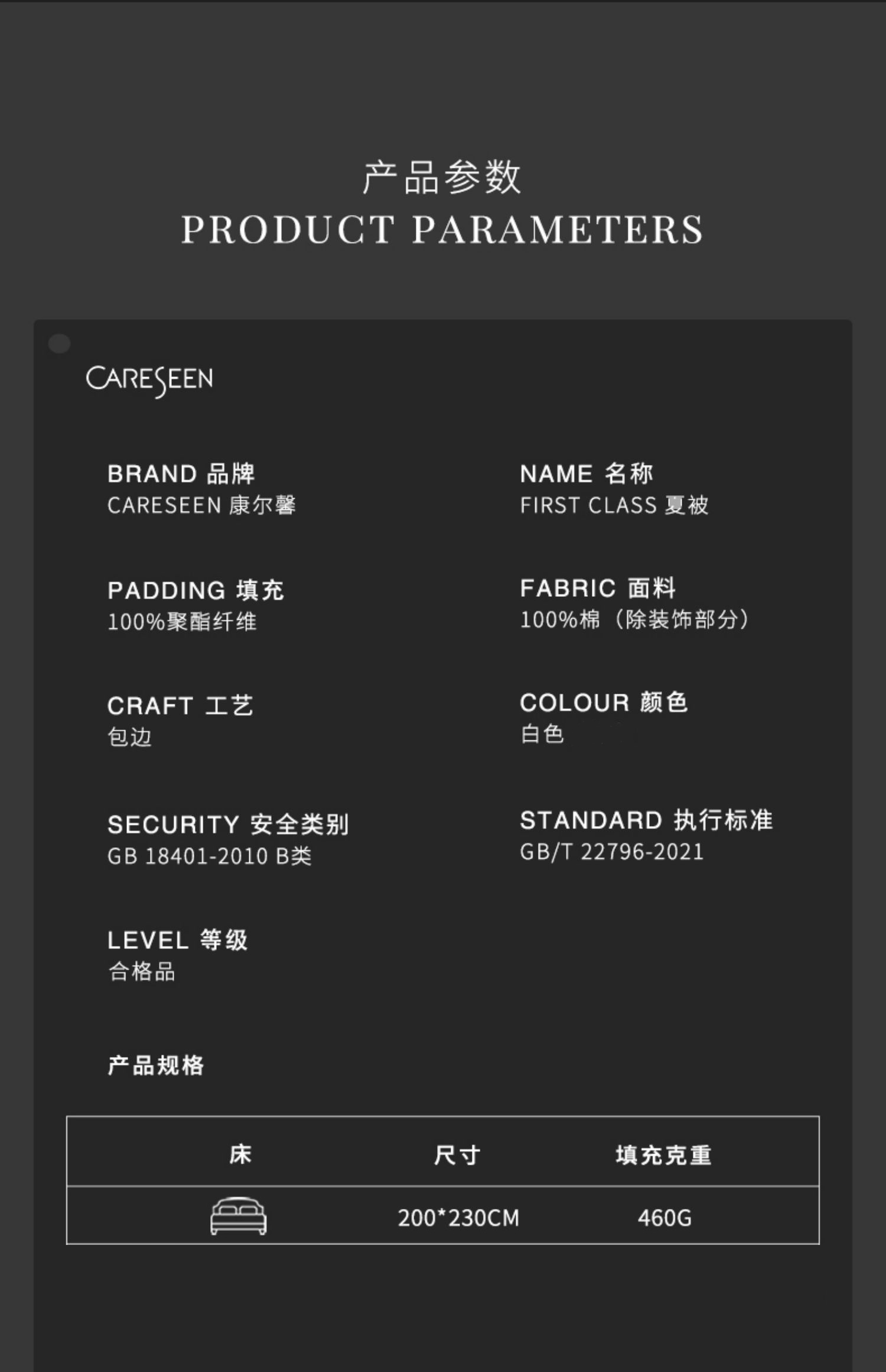 商品名称:康尔馨FIRST CLASS 全棉抗菌夏被夏被彩盒(单位:床) 白色 200*230cm